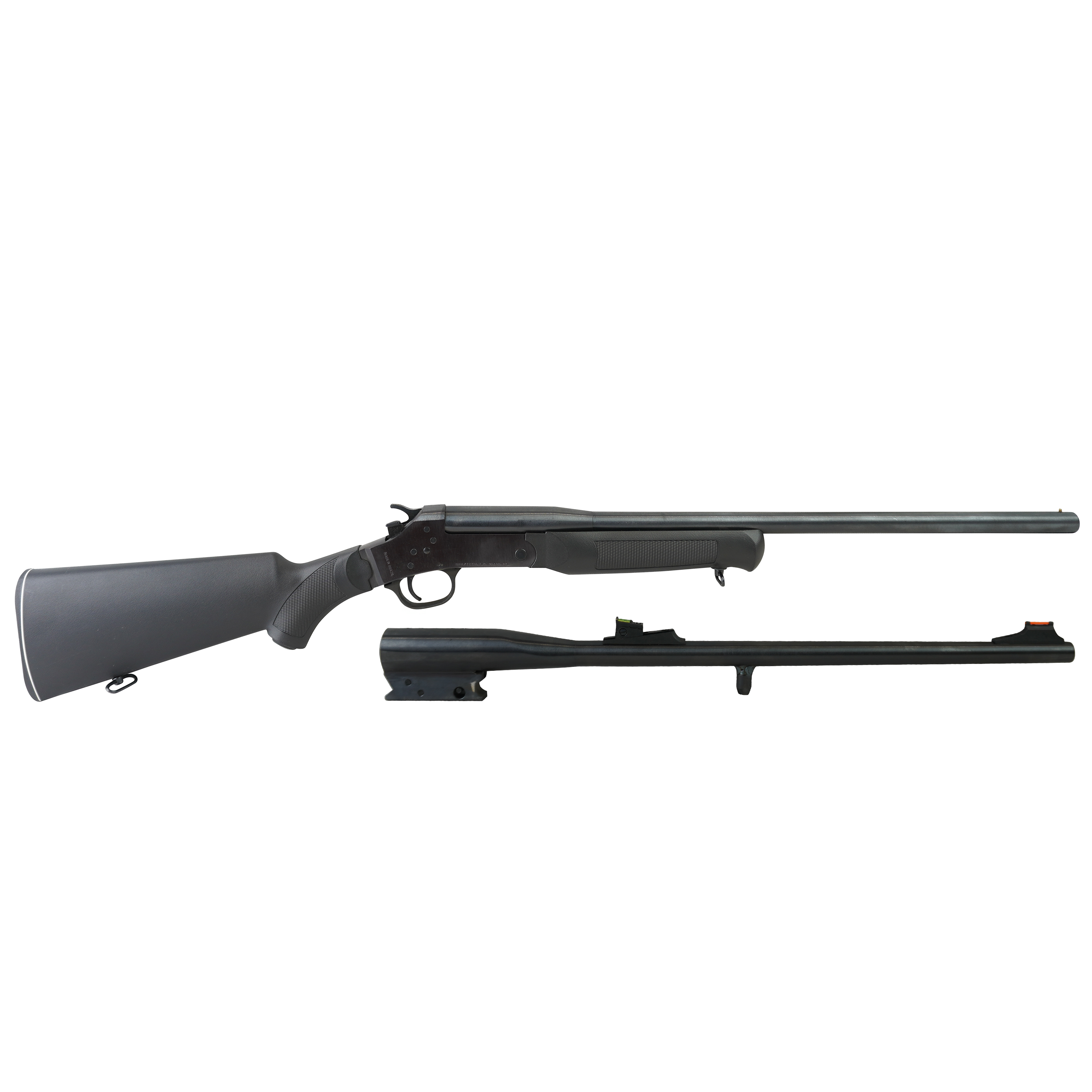 Single Shot, 22” 20 GA X 3″ Barrel With Fixed Modified Choke, 18.5″ Cal.22 LR Barrel With Sights, Black Synthetic Stock & Forend