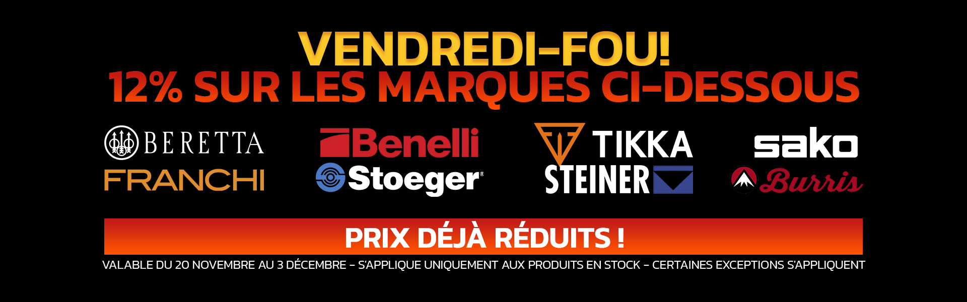 ÉCONOMISEZ 12 % – PRIX DÉJÀ RÉDUITS ! Valable du 20 novembre au 3 décembre 2025. Valable sur une sélection de produits Beretta, Benelli, Tikka, Sako, Franchi, Stoeger, Steiner et Burris. Certaines conditions s’appliquent.
