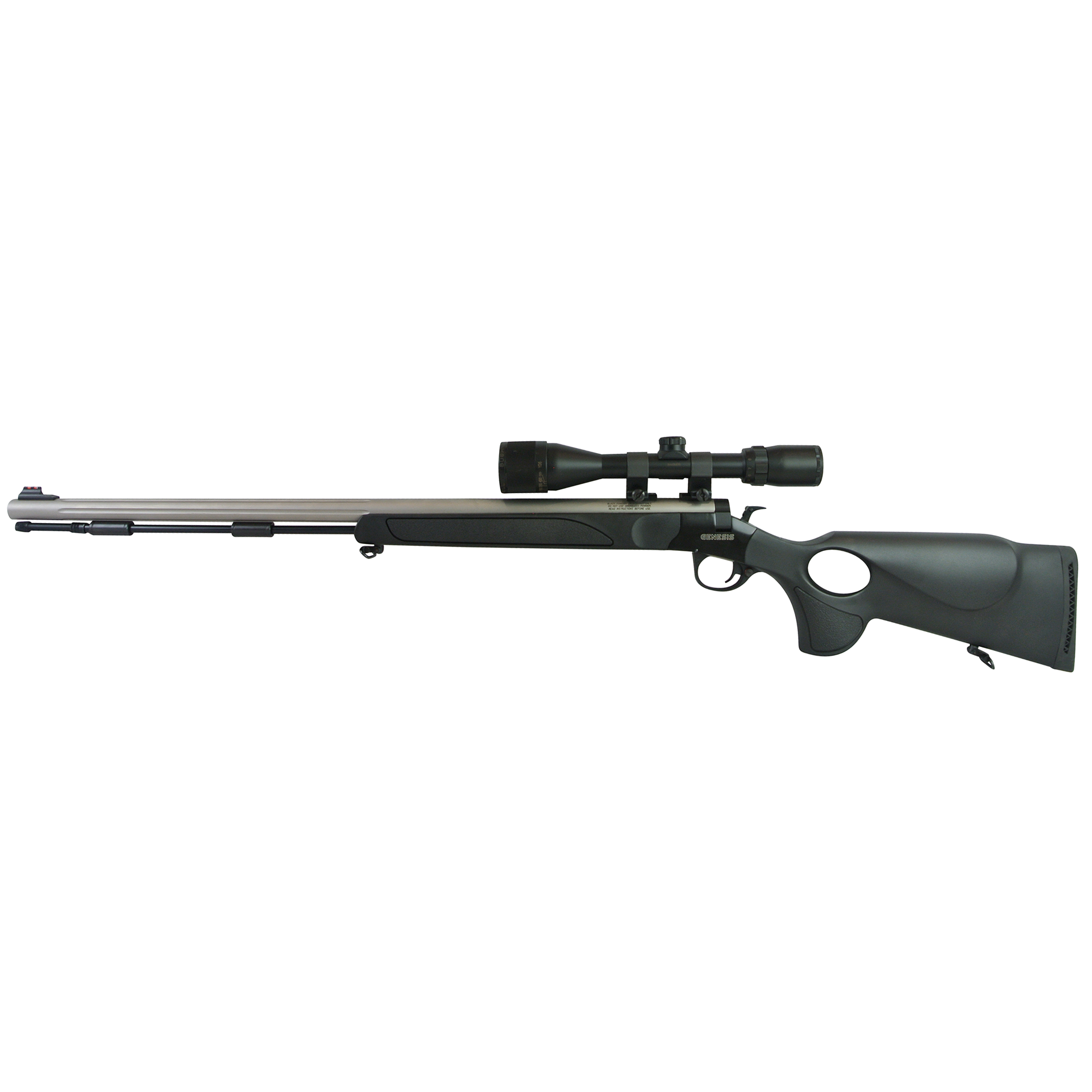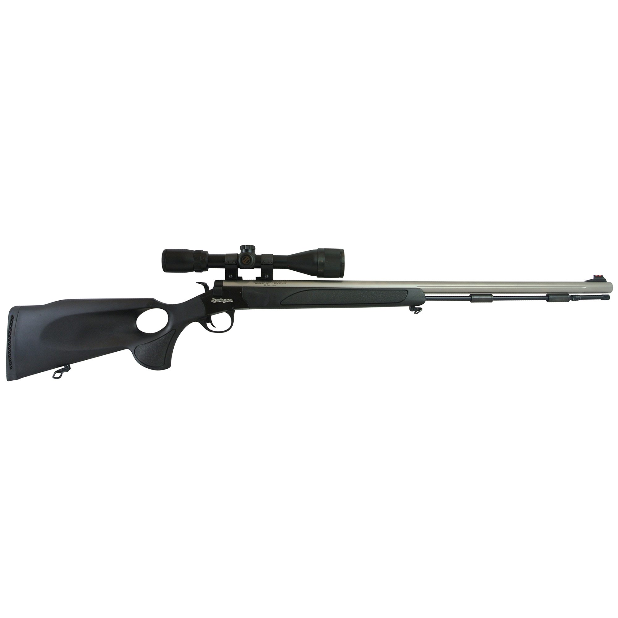 - Chargement Par La Bouche, 50 Cal., Canon Inox Fluté 28″, Crosse Noir Synthétique Avec Poignée Pistolet + Bushnell Banner 4-12x40mm, Mire Arrière Manquant